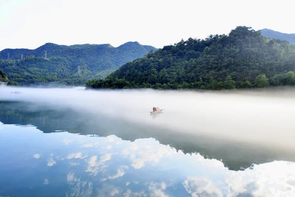 湖中的万千倒影立即被荡开了,碧绿的湖水织起了一道道波纹,水波不断扩展,不断延伸。我走出船舱,立于船头,迎着清凉的湖风,看着烟波浩淼的湖面,心里有一种说不出的舒畅。绕过几座小山之后,湖面越发壮美开阔起来,并感灵气升浮,颇有"万顷碧波照大千"之势。